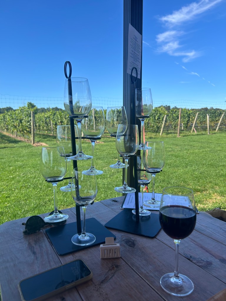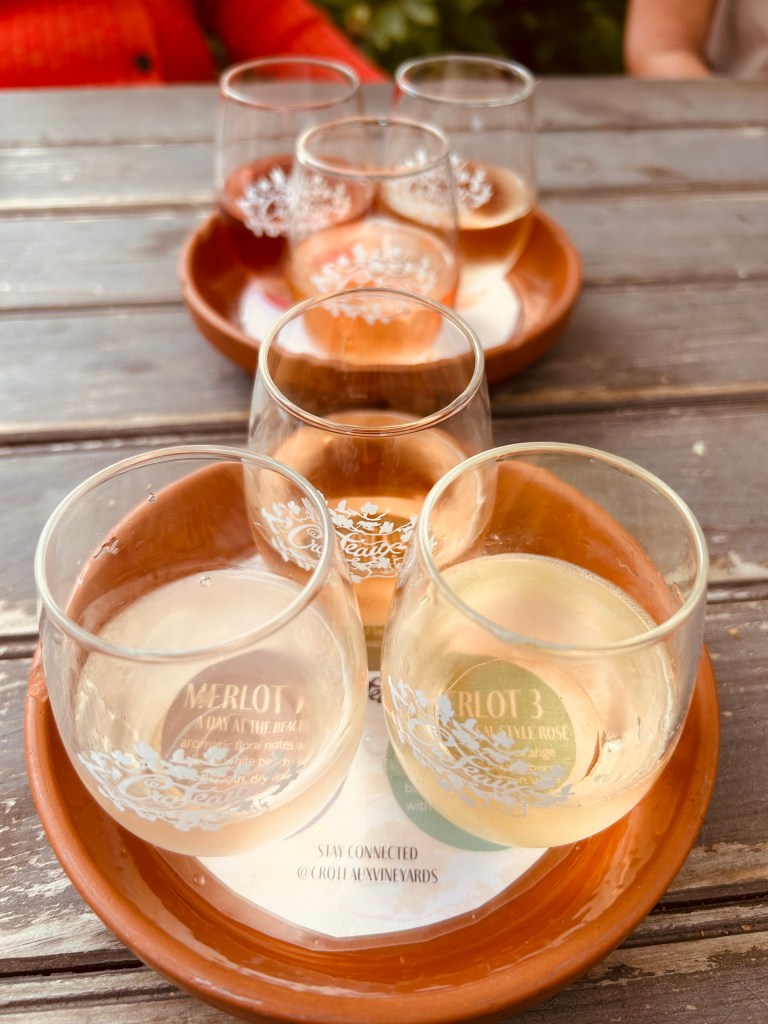 Next up: Croteaux Vineyards, the only vineyard in the U.S. dedicated exclusively to rosé. The barnyard-style setting is laid-back yet chic, with live music, glasses of still and sparkling rosé, and flights served on labeled trays — a nice touch. I loved wandering through the vines with music in the background, glass in hand.