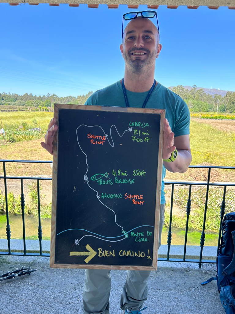 We kicked off our Camino at Ponte de Lima, Portugal’s oldest village, beginning along an easy stretch of the 17th stage of the Caminho Português one of the historic pilgrimage routes that begins in Lisbon. The path wound gently through farmland, vineyards, and picture-perfect villages, each one a postcard of northern Portugal. Our guides, Christian and Cesar, reminded us of the golden rule: when in doubt, follow the scallop shell. These little markers, the symbol of St. James, dot the Camino paths and point pilgrims in the right direction.